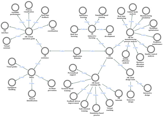 In the initial phase of this process, the evaluation examines the manner in which corporate entities and research centres utilise AR in the context of industrial assistance and training. In accordance with this classification, we employed the NVivo 14 software to conduct a qualitative analysis and corresponding coding, guided by the methodology established by Saldaña [103]. In this manner, the 60 studies were classified into three categories: 29 focused on the care domain, 24 on the training domain, and 7 addressed both areas. Within the assistance domain, 29 studies were categorised into specific areas, such as the use of AR to guide industrial operations and safety-focused assistance. Conversely, in the context of training, the 24 studies were grouped into areas such as immersive learning, manufacturing process analysis, design tools and AR-based learning resources for industrial applications.