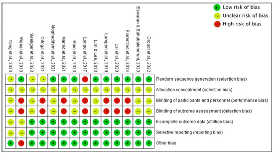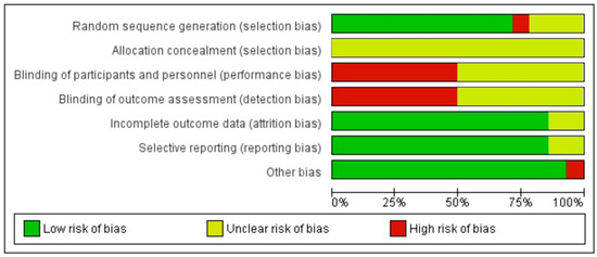 The meta-analysis technique employed in this study allows for the synthesis and review of primary research. Its effectiveness depends on an accurate and detailed analysis of the included studies. In our research, both authors examined the risk of bias of the selected studies using the Cochrane assessment tool [112,113]. This assessment encompasses critical aspects such as random sequence generation, allocation concealment, the blinding of participants and personnel, the blinding of the outcome assessment, incomplete outcome data, selective reporting and other biases.