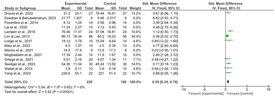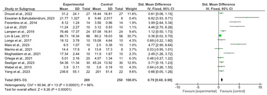 Of the 60 studies initially considered, 14 met the inclusion criteria and were subjected to meta-analysis using Review Manager 5.4.1 software [109,110,111]. These criteria were based on five key aspects: