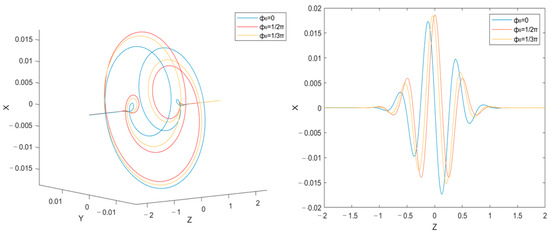 In Figure 2, we plot the motion trajectories of electrons in different CE phases of , , and , and the pictures show the polarization characteristics of the electron motion consistent with the laser pulse. At the same time, by observing the two-dimensional diagram of the motion trajectory, we find that the motion trajectory has symmetry about the 0 axis. As shown in Figure 2, the movement direction of the electron is along the z-axis direction from right to left. In our research, the analysis of the trajectories of electrons plays a critical role in deriving crucial physical quantities pertaining to the radiation field. Through the numerical simulation of the electron trajectories in the presence of a circularly polarized, tightly focused laser pulse, we are able to track the intricate dynamics of these relativistic particles as they interact with the laser’s electromagnetic fields. This serves as the foundation for our subsequent research.
