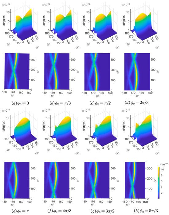 Figure 3a–h depict the spatial radiation angle distribution of , , , , , , , and at the initial laser phase, given an initial electron energy of . Significantly, when an electron traveling in the negative z-axis direction collides with a circularly polarized laser in the positive z-axis direction, the radiation energy attains its peak at a specific angle of around . As the initial phase increases, the polar angle remains constant at the point of maximum radiation energy, while the azimuth angle varies from 0 to 2. Furthermore, our calculations reveal a linear positive correlation between the azimuth angle corresponding to the maximum radiation and the initial phase. Moreover, it indicates that the radiation peaks in the direction of laser incidence.