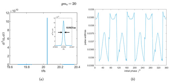 Subsequently, we intensified the pulse and observed a distinct single-peak pattern in the wave crest of the circularly polarized laser pulse, as depicted in Figure 5a. As the initial phase shifted, the pulse width of the wave crest experienced slight variations. Figure 5b illustrates the correlation between the pulse width and the initial phase. A thorough analysis of the figure, coupled with detailed calculation data, revealed the periodic nature of the pulse width concerning the initial phase, exhibiting a period-like characteristic of . The pulse width fluctuated within a range of 0.0409 to 0.0436 as.
