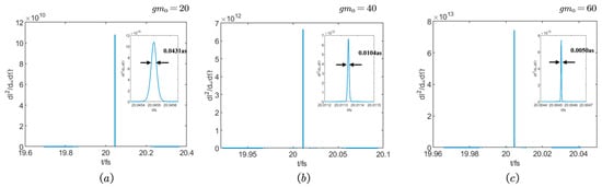 We further obtained the laser pulse diagram at the initial energy of and , respectively, and compared it with that when the initial energy of the electron was . As Figure 6 illustrates, an increase in the initial electron energy results in a corresponding increase in the peak value of the laser pulse and a concurrent decrease in the pulse width. Specifically, for an initial electron energy of , the pulse width measures approximately 0.0104 as, whereas, for an initial electron energy of , the pulse width narrows to around 0.0050 as.
