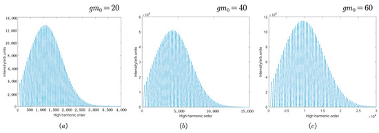 Subsequently, this paper delves into the spectral characteristics. When the initial electron energy is set to , it is observed that the spectrum remains largely unchanged across different phases. Irrespective of the phase, the radiation intensity consistently diminishes from to zero as the harmonic frequency increases, experiencing a decrement of four orders of magnitude. This trend is demonstrated in Figure 7a. Observably, within this spectrum, the harmonic modulation disappears during the scattering of the laser pulse. Furthermore, the nonlinear Thomson scattering spectrum exhibits distinct harmonic peaks, characterized by an excellent resolution and significant amplitude variations. It is worth noting that the initial phase of a tightly focused, circularly polarized laser has a minimal impact on the resulting spectrum.