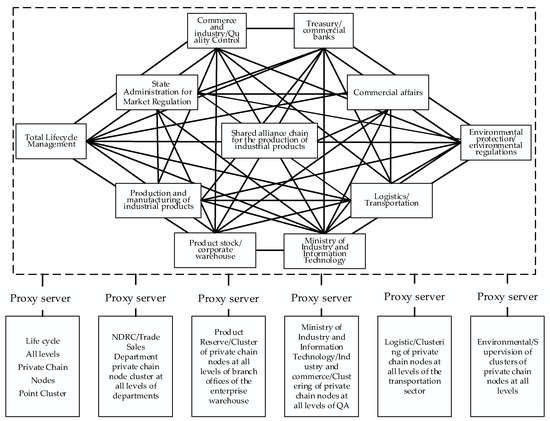 The system architecture of this industrial product quality traceability system consists of an alliance chain and multiple private chains, in which the alliance chain consists of the whole life cycle supervision, the General Administration of Market Supervision, the production and manufacturing of industrial products, industry and commerce, quality inspection, product stockpiling, finance, the Ministry of Industry and Informatization, logistics, environmental protection, and other departments as nodes. According to the “Supervision and Management Provisions on the Implementation of Quality and Safety Responsibility of Industrial Product Manufacturing Units” and “Supervision and Management Provisions on the Implementation of Quality and Safety Responsibility of Industrial Product Sales Units” issued by the General Administration of Market Supervision and Regulation, and in combination with the market circulation norms for industrial products, we will arrange and deploy the nodes of the alliance chain mentioned above according to their functions and classify them into four subsystems, which are the production and manufacturing subsystem; the sales, circulation, transportation, and logistics subsystem, the product reserve subsystems; and the regulatory subsystems, respectively, to build a private chain of the four subsystems. Based on the data interactions and storage requirements for the quality information on the whole life cycle of industrial products, the hybrid blockchain adopts the Interplanetary file system (IPFS) network. Constructed based on BitTorrent protocol and Kademlia Distributed Hash Table (DHT) technology, it ensures that the peer nodes in the network structure can conveniently relocate objects and manage metadata, and each private chain interacts with alliance chains through a proxy server for data interaction and information sharing. Product design/decision-making, raw material procurement/supply, product manufacturing/production processes and early warnings, product warehousing/stockpiling, sales/packaging, logistics/transportation, use/condition monitoring, maintenance/inspection and repair, decommissioning/recycling and remanufacturing, and other quality information generated in the process of quality traceability for the whole life cycle of industrial products are uploaded to the private chains and their corresponding sub-systems for storing and sharing. Each private chain has at least one management node in the alliance chain, through which the private chain and the alliance chain realize information sharing and interaction. The industrial product quality traceability system is vertically coordinated at the national–provincial–municipal–county levels. It contains government departments such as the Ministry of Industry and Information Technology, the General Administration of Market Supervision, the Ministry of Commerce, the Industry and Commerce Bureau, the Ministry of Transportation, and other government departments and supply chain segments, such as manufacturing enterprises, stockpiling enterprises, transportation enterprises, etc. The blockchain-based industrial product quality traceability system compensates for the top-down pyramid storage model of the traditional quality traceability system and is combined with industrial internet identity resolution technology; it provides an opportunity to solve the problem of information islands during the whole life cycle management of industrial products and the circulation of elements and to realize data interoperability, credible identity resolution, and massive information mining.