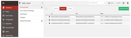 This part explains the blockchain-based industrial product quality traceability process according to three stages, preparatory monitoring, production practice, and life cycle management, as shown in Figure 4. test_mycc is the database for this system, as shown in Figure 5. The fabric uses CouchDB, a blockchain state-of-the-world database, and stores the state of the world and history in JSON format. Based on the alliance chain, to secure the storage of the traceability data, the generation of each new block needs to be voted for by the nodes of all the alliance chains, combined with the DDBFT consensus algorithm to guarantee the reliability and security of the traceability data.