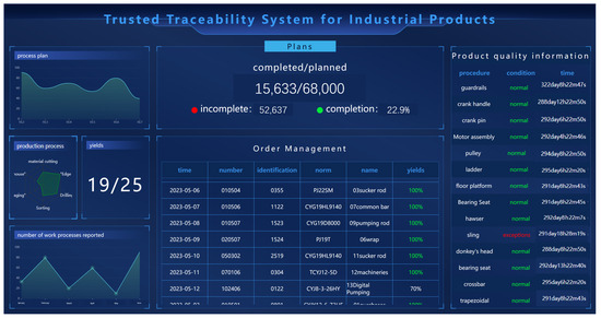 The blockchain-based industrial product quality traceability system includes web services and front-end pages and is built based on the Hyperledger Fabric technology architecture. With the web front-end developed using Vue and Node.js technology, users can use permissions to fill out data in the front-end, including consumer feedback, anti-counterfeiting information, logistics information, etc., with the server processing them to return them to the JSON data format to store their history. The web page is written using Vue.js + HTML + CSS, combining the requirements of industrial product life cycle management with the design of functional classification names and the coding of the user interface and providing a user interaction interface with View and ViewModel elements and a modularized data application. Hyperledger Fabric, an open-source project under the Linux Foundation, provides enterprise users with a scalable, modular blockchain platform that allows users to configure consensus validation and smart contracts based on business attributes. Using the popular uni-app cross-end development framework, you can use code to generate small programs, such as Android and iOS terminals. The large screen for monitoring the industrial product quality information during the manufacturing phase is shown in Figure 6.