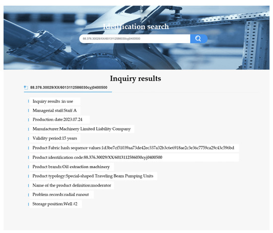 We develop and deploy the industrial product information traceability system under the environment built above, take the quality and safety information on the critical parts of a specially shaped beam pumping machine produced by a Xinjiang petroleum machinery manufacturing enterprise as a sample to test, carry out the uplink operation for the product’s information, execute the same endorsement strategy, and synchronize the storage among the nodes, and the product quality and safety information of the industrial product can be traced through the QR code of the associated identification information. Figure 7 shows the general consumer traceability query page; by entering the product’s unique identification code for a product traceability query, you can query information on the product from its production to its sale in the intermediate stage from various links in the information. In terms of the state of the product, the department/point inspector to which it belongs, and its production date, the product is associated with the code ID, Fabric hash sequence value, and other information, breaking the traditional information exchange barriers in the traceability process between enterprises to improve the efficiency of product traceability; when there are product quality problems, we can quickly locate the responsible body and pursue those responsible for remediation. An example of partial traceability data validation for industrial products is shown in Table 3.