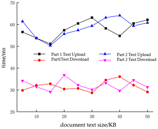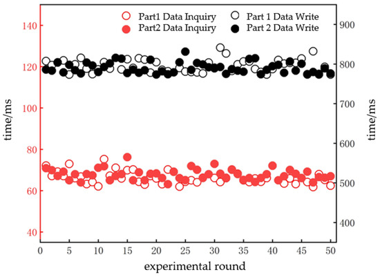 We perform data writing and querying using the test tool Postman (version 8.0.6), testing shared data from the alliance chain, including text and image information. All the tests are repeated 20 times, each time sending the same type and size of data, and we record the response time of each request, ultimately taking the average of all the test results in order to ensure that the average response time is relatively stable and reliable. The system was tested for 50 rounds through the interface. The performance test results are shown in Figure 8 and Figure 9. Among them, the average upload time for donkey pump and moving beam text data is 51.592 ms and 52.448 ms, respectively; the average download time is 31.64 ms and 32.25 ms, respectively; the average write time for the data is 786.571 ms and 785.896 ms; and the average query time is 65.376 ms and 67.700 ms, respectively, which can meet the needs of consumers and enterprises to obtain product information quickly. At the same time, data on donkey pumps and moving beams, key components of petroleum machinery and equipment, were used for comparisons during the testing process. The results show that the uploading, writing, querying, and downloading times for the two types of parts tend to be the same, and the system is more stable.