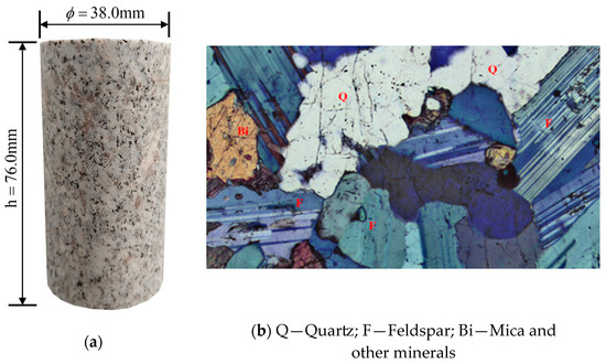 The granite samples used in this study were obtained from Huangbai Town, Yueyang City, Hunan Province, China. According to international standards of rock mechanics, the granite was processed into cylindrical samples with a diameter of 38 mm and a height of 76 mm. The surface of the samples is smooth and even, with uniform particles. The natural density of the granite is 2.675 g/cm3, and the porosity is 0.926%, as shown in Figure 1a. Figure 1b displays a polarized microscope image (magnification: 5×) of the internal structure of the granite sample. From the image, it can be observed that at the microscopic level, the granite is a heterogeneous material composed of different minerals, with variations in the physical and chemical properties between different minerals reflected in the color differences in the polarized image.