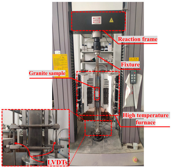 This research conducted uniaxial compression tests at six real-time temperatures (25 °C, 200 °C, 300 °C, 400 °C, 500 °C, and 600 °C). In order to ensure the accuracy of the experiments and minimize the experimental errors caused by variations in the composition of the granite structures, three samples were tested simultaneously at each temperature. The experimental apparatus, as illustrated in Figure 2, primarily consisted of three systems: loading, temperature control, and data acquisition, operated by a microcomputer-controlled electronic universal testing machine. The loading system included a reaction force frame, high-temperature clamps, a high-temperature furnace, and displacement sensors (LVDTs). The heating rate was set to 5 °C/min. Upon reaching the target temperature, to mitigate the thermal gradient effect on the granite and ensure the uniform heating of the samples, the samples were held at a constant temperature for 2 h before testing commenced. The tests were conducted under displacement-controlled loading at a rate of 0.1 mm/min, with a fixed force attenuation amplitude of 60%. The samples were loaded continuously until failure, with the axial force and displacement changes recorded throughout the entire process. The final test results are presented in Table 1.