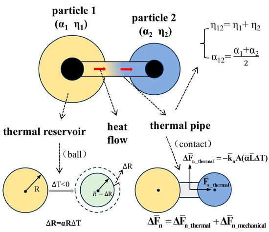 In PFC2D thermal–solid coupling, thermal storage and conduction processes can be simulated. The thermal conduction between particles is achieved through thermal pipes, where the medium storing heat is the particles, and the contact between particles serves as the thermal conduction pipes. Thermal strain is generated through the interaction between the thermal expansion of particles and temperature changes. The thermal expansion radius of particles can be calculated using the following formula: