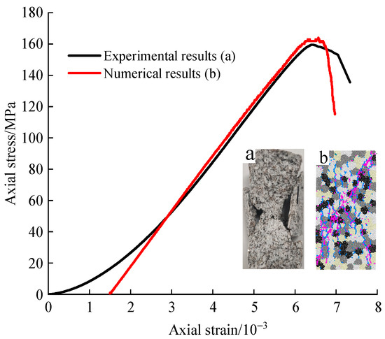 In PFC, due to the lack of a direct correspondence between microscale parameters and macroscopic mechanical behavior, a trial-and-error method is commonly employed for calibration. This involves continuously adjusting microscale parameters by comparing the macroscopic mechanical parameters obtained from numerical simulations with those from laboratory experiments, including uniaxial compressive strength, elastic modulus, peak strain, and failure modes, to match the results of PFC simulations with laboratory experiments [39]. Based on the mechanical performance relationship between different mineral crystals in granite (quartz > feldspar > mica > intergranular), and referring to the range of microscale parameter values used in previous studies, different parameters are assigned to intragranular and intergranular contacts [27,28]. At room temperature (20 °C), with a loading speed set to 0.05 m/s, the elastic modulus and bonding strength within and between mineral crystals were adjusted. Suitable parameters were chosen for the uniaxial compression test. The stress–strain curve obtained from simulation was compared with the results from laboratory experiments (Figure 5), revealing a good agreement. Additionally, both exhibited a distinct X-shaped failure pattern, indicating the effectiveness of the parameter calibration.