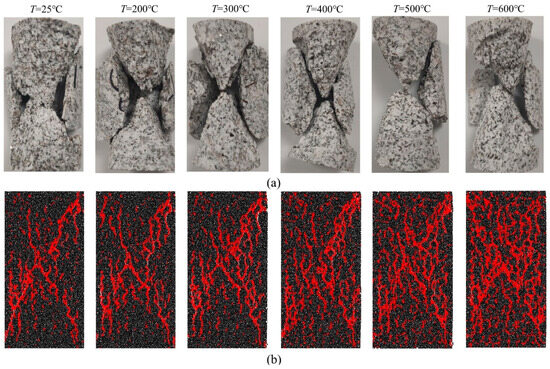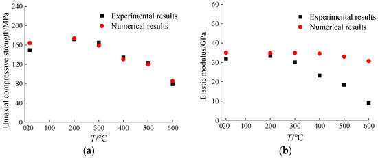 Figure 6 compares the compressive strength and elastic modulus of granite obtained from the experimental and numerical simulations at different temperatures. As shown in Figure 6a, the uniaxial compressive strength obtained through numerical simulation follows a trend consistent with the experimental results as temperature varies. At temperatures below 200 °C, the high-temperature effect leads to an increase in the uniaxial compressive strength of granite. Between 300 °C and 500 °C, the uniaxial compressive strength gradually decreases with increasing temperature. At 600 °C, the compressive strength significantly decreases. As shown in Figure 6b, currently, there is no effective method in PFC to simulate mineral transformation and chemical reactions during the heating process under real-time high-temperature conditions for granite. Consequently, the deformation of particles after 400 °C is underestimated, resulting in elastic modulus values higher than those obtained from experimental results [40].