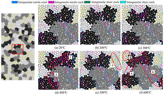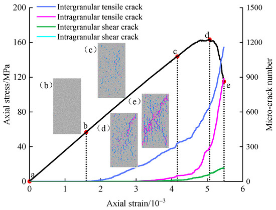 To visually illustrate the entire process of crack initiation and propagation within granite, the crack evolution during the compression process of granite at room temperature is divided into four stages, as shown in Figure 8. (1) Initial densification stage (curve ab): The stress–strain relationship is linear, indicating that cracks have not yet initiated due to the relatively small load. (2) Elastic stage (curve bc): The number of cracks gradually increases with the increase in load. Compared to intragranular contacts, the intergranular contacts are weaker. When the tensile stress on the sample exceeds the tensile strength between mineral crystals, dispersed intergranular tensile cracks rapidly form. (3) Plastic strengthening stage (curve cd): The rate of crack development further increases, with a significant increase in the number of intragranular tensile cracks compared to the elastic stage. Additionally, shear failure cracks begin to appear during this stage. At point d, where the peak stress is reached, crack development becomes concentrated, and the failure mode of the sample becomes foreseeable. (4) Post-peak failure stage (curve de): The slope of both intergranular and intragranular tensile crack curves significantly increases compared to the previous stage. Although a certain number of intergranular shear cracks have formed, tensile failure cracks still dominate. At this stage, crack propagation weakens the overall strength of the material, leading to a gradual decrease in stress and the eventual macroscopic fracture of the sample.