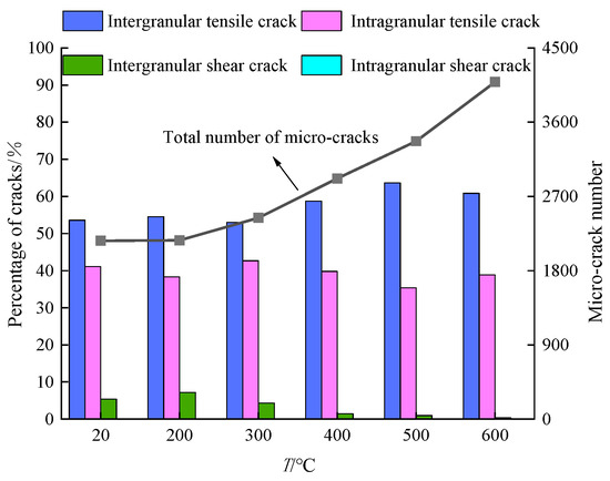 To investigate the influence of high temperature on the damage and failure of granite under uniaxial compression, Figure 9 presents a statistical analysis of the total number of microcracks and the proportions of different types of cracks observed in the samples at different temperatures. It is observed that at 200 °C, the effect of high temperature on the mechanical properties of the granite samples is minimal, with the number of microcracks remaining relatively unchanged compared to that at room temperature (20 °C). Due to the lowest intergranular tensile strength, intergranular tensile cracks constitute the majority of cracks, accounting for 92.8% of the total microcracks. This result is consistent with the viewpoint proposed by Kranz [41] that shear strength exceeds tensile strength in brittle materials. At 300 °C, the differential coefficients of thermal expansion of the mineral crystals result in the uneven expansion of the sample, accelerating the development of microcracks, albeit with a slight decrease in the proportion of intergranular tensile cracks. Between 400 °C and 500 °C, the continued weakening of intergranular bonding leads to a further increase in the rate of microcrack formation due to structural damage to the mineral crystals. During this period, the rate of intragranular crack expansion remains lower than that of intergranular cracks. Upon reaching 600 °C, there is a sharp increase in the number of microcracks, nearly doubling compared to that at 20 °C.
