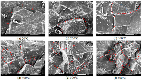 Figure 11 presents scanning electron microscope images of the fracture surfaces of the granite samples after real-time high-temperature uniaxial compression tests. The development of microcracks in the samples at different temperatures varies significantly, indicating a significant influence of high temperature on the microcrack evolution in granite. At 25 °C, the fracture surface of the granite sample contains only a few native microcracks, indicating that the internal structure of the granite is nearly intact, with mineral particles arranged relatively closely. At 200 °C, the effect of high temperature causes some initial microcracks to begin closing, and the expansion of mineral particles improves the microstructure of the granite. When the temperature rises to 300 °C, internal stress between particles increases, resulting in the deformation and delamination of mica, leading to a continuous increase in intergranular cracks [45]. With the temperature further increasing, thermal damage becomes more severe. Between 400 °C and 500 °C, the fracture surface becomes rougher, with a significant increase in the number of dense cracks. The widths and lengths of the cracks also increase, and the damaged zones along the crack edges are more prone to initiate new cracks under the interaction of frictional forces. This also leads to the connection and propagation of some intergranular and intragranular cracks, forming distinct crack aggregation zones [46]. After 600 °C, due to the α-β phase transition of quartz at 573 °C, transgranular cracks appear abundantly on the fracture surface, with a wider distribution and deeper aggregation. Many crystals are divided into small pieces, forming a honeycomb-like structure, accompanied by a large amount of debris generation [47].