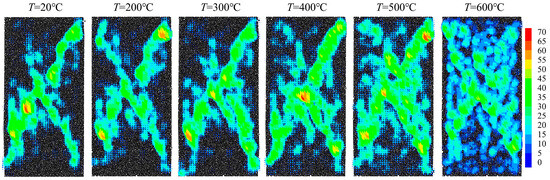 By searching for the crack quantity within a certain range and utilizing the “scalar” units in PFC, the crack heatmap of the sample after failure is plotted, as shown in Figure 12. It can be observed that from 20 °C to 200 °C, cracks mainly develop along two diagonal shear bands, with a relatively concentrated distribution. In the image, this is manifested by narrow crack bands and a lower degree of crack aggregation. From 300 °C to 400 °C, the two main crack bands gradually expand outward, with some cracks starting to extend around them. At this point, the thermal damage to the granite becomes significantly aggravated, and the degree of crack aggregation increases. At 500 °C, the crack bands start to become “blurry”, and cracks at the edges quickly connect to the main cracks, indicating a further increase in the impact of high temperature on the sample. When reaching 600 °C, cracks have extended throughout the entire sample, with a more uniform distribution, indicating that the granite sample becomes tougher with increasing temperature.