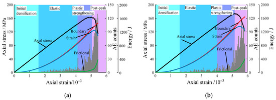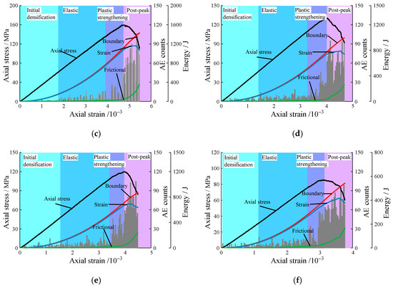 For the room temperature samples, as shown in Figure 13a, the results correspond to the four stages of stress–strain curve and crack development of the granite mentioned above, with different characteristics in acoustic emission activity and energy evolution. In the initial densification stage, there are very few acoustic emission signals. The bonds between particles are not yet broken, and the energy is still in an accumulation state. The boundary energy is entirely converted into strain energy stored between the bonds. The strain energy curve coincides with the boundary energy curve, exhibiting a nonlinear parabolic growth, with a very small growth rate. In the elastic stage, acoustic emission events gradually appear, but the amplitude and frequency are still small. With the increase in stress, the frictional energy slightly increases, and the boundary energy begins to separate from the strain energy curve. In the plastic strengthening stage, acoustic emission activity gradually becomes frequent, with an increase in amplitude and frequency. Although the strain energy still shows an increasing trend, the growth rate gradually decreases and drops to zero at the peak point. The strain energy stored between particles is released. Upon entering the post-peak failure stage, the number of acoustic emission events sharply increases, and the amplitude intensifies. When reaching the peak stress, the number of acoustic emission events does not reach its peak but lags behind the peak stress point. At this point, the strain energy is at a critical value, and the work performed by external forces mainly converts into frictional energy.