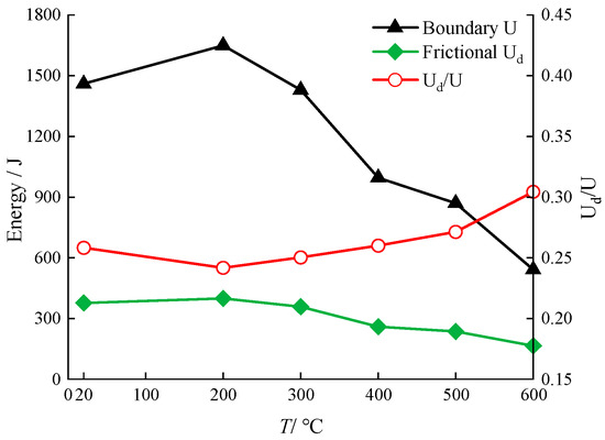 Figure 14 illustrates the variation in boundary energy and dissipation energy of the granite sample during failure as a function of temperature. Compared to ambient temperature conditions, at 200 °C, the boundary energy increases while Ud/U decreases, indicating an increase in the released strain energy during failure and a slight enhancement in the strength of the granite sample. As the temperature rises from 200 °C to 500 °C, the curves of boundary energy and dissipation energy continue to decrease. Particularly at 400 °C, the boundary energy sharply decreases, indicating a significant weakening of the ability of the granite to store strain energy internally. Consequently, the damage caused by the release of strain energy after reaching peak strength diminishes. Meanwhile, during this temperature range, the Ud/U curve gradually increases, indicating that with the rise in temperature, the particles are more prone to movement and slipping. Upon reaching 600 °C, the Ud/U value further increases, indicating that high-temperature effects lead to a more gradual failure of the granite, with weakened resistance to deformation and enhanced ductility.