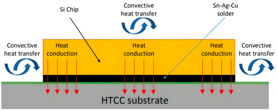 The High-Temperature Co-fired Ceramic (HTCC) substrate is made by co-firing ceramic sheets with conductive pastes such as W, MO, and Mn at high temperatures. It has higher thermal conductivity (compared to ordinary PCB board), high heat resistance, high insulation, high strength, and a well-matched coefficient of thermal expansion, making it the optimal choice for the substrate of MCM components. Therefore, this paper uses it as the substrate for MCM components. Details of the relevant parameters are listed in Table 1, Table 2 and Table 3. Additionally, the structure of a single chip and a schematic diagram illustrating heat transfer as shown in Figure 5.