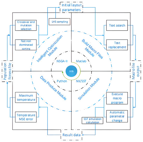 Against the backdrop of the increasing demand for intelligence in high-tech fields such as the military, aerospace, computer, communication, and automotive industries, the Multi-chip Module (MCM) has been favored as a new technology that breaks through the inherent bottlenecks of traditional packaging due to its high performance, miniaturization, and high reliability [1,2,3,4]. However, due to the continuous increase in power consumption within integrated circuits, the heat issue in MCM is becoming increasingly prominent. According to relevant research reports, nearly 60% of electronic component failures are due to temperature anomalies, with the failure rate doubling for every 10 °C increase in chip junction temperature [5,6]. Therefore, thermal management of chips is crucial. This paper focuses on Heat Source Layout Optimization (HSLO) in MCM, treating chip layout as the heat source layout. It explores how to place all chips on the substrate to ensure uniform heating without compromising equipment performance and design requirements. This research has important practical significance and application prospects, providing new ideas and solutions for the thermal management of MCM [7]. Currently, scholars have proposed various research methods for the optimization of heat source layout in MCM. For example, Ning Y et al. proposed a method using a particle swarm algorithm to optimize the established layout mathematical model [8], Yang J et al. introduced a novel, improved thermal directional placement algorithm [9], and Lopez-Villegas J M et al. proposed a systemic approach to enhance the quality factor of RF-integrated inductors [10]. These methods typically start with approximating a simulation using simple models, followed by the optimization of the layout of MCM, but lack simulation comparisons. Chen X et al. proposed a method that establishes a surrogate model of MCM and combines the HSLO optimization algorithm for layout optimization [11]. Sun J et al. introduced a heat source layout reverse design method based on the deep learning show, attend, and read model [12]. Qian C et al. presented a layout design method based on adaptive neural networks [13]. These methods have improved accuracy and assurance, but training costs continue to rise with increasing accuracy requirements. Cuco A P C et al. proposed a multi-software integration method combining CAD with optimization algorithms [14]. Chang Y K applied the system engineering design tool to conceptual designs for small satellites [15]. Z Li et al. addressed the effective payload packaging design problem in satellite modules by proposing a hybrid multi-institution optimization method [16]. These methods utilize physical models established by simulation software which are closer to actual engineering applications and avoid the expensive costs associated with high training. This paper adopts the physical model approach. However, it is necessary to validate the optimization results through simulation and, as the model complexity and iteration times increase, the costs in terms of human labor and time also increase. Xiong and colleagues applied a system framework in spacecraft thermal design that significantly reduced human and time costs [17]. Therefore, this article adopts the conceptual framework of this system to redesign an automated system for thermal source layout optimization. This system aims to enhance optimization efficiency while ensuring the quality of the optimization results.