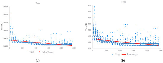 After 40 rounds of iteration, the results of applying the automatic optimization system framework to MCM are presented based on the PCB board temperature extreme index and temperature uniformity index, as shown in Figure 8. Figure 8a displays the indices of all individuals in the 40 rounds of iteration and their exponential trend fitting, while the Figure 8b displays the same information. The exponential fitting results are shown in Formulas (2) and (3). The following results can be obtained: the temperature range of all solution sets is within [344.06 K, 346.05 K], and the temperature uniformity index is within [0.73 K, 3.93 K]. As the iterations progress, the fitness values of both indices show a continuous convergence trend, with the optimal temperature index reaching 344.06 K and the optimal uniformity index reaching 0.73 K.