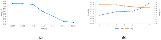 The solution to the MCM layout problem is a bi-objective optimization process, where the two indices are not independent but coupled, leading to a Pareto problem. In the IOF system, the 40 individuals generate a total of 2400 solution sets after 40 rounds of iteration. By correcting the solution sets with the constraint (8) and removing solutions that do not meet the constraints of the two indices, the Pareto front of MCM and the bi-objective Pareto feasible solutions are plotted, as shown in Figure 9a,b. The Pareto front consists of seven selected optimal solution sets that meet the engineering application constraints, with the temperature index within [344.06 K, 344.17 K], and the uniformity index within [0.73 K, 0.88 K].