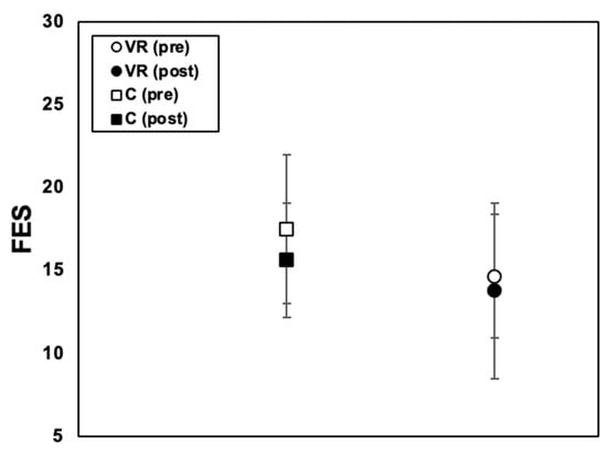 Tinetti Falls Efficacy Scale (FES) results for VR group and control group data, pre-training (open icons) and post-training (filled icons), with standard error bars shown.