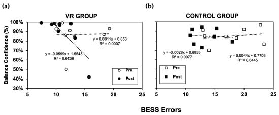 Activities-Specific Balance Confidence (ABC) results as a function of the Balance Error Scoring System (BESS) for (a) VR group and (b) control group, pre-training (open icons) and post-training (filled icons).