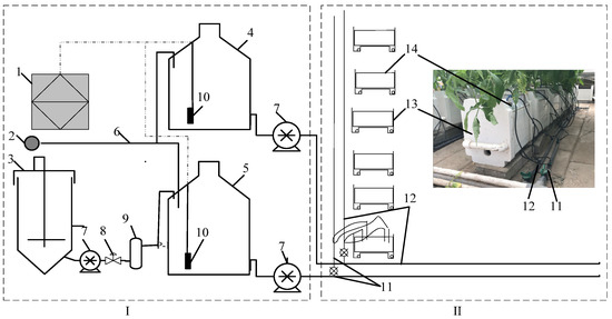 Schematic diagram of automatic fertigation applicator and irrigation system for organic and inorganic nutrient solutions. (Ⅰ) The automatic fertigation applicator for organic and inorganic nutrient solutions; (Ⅱ) The irrigation system and the cultivation system. 1. Controller; 2. Water source; 3. Fermentation tank; 4. Inorganic nutrient solution bucket; 5. Organic liquid fertilizer bucket; 6. Clean water pipe; 7. Self-priming pump; 8. Solenoid valve; 9. Filter pump; 10. Conductivity sensor; 11. Organic liquid fertilizer irrigation pipes; 12. Inorganic nutrient solution irrigation pipes; 13. Cultivation tank; 14. Substrate (coconut bran brick).