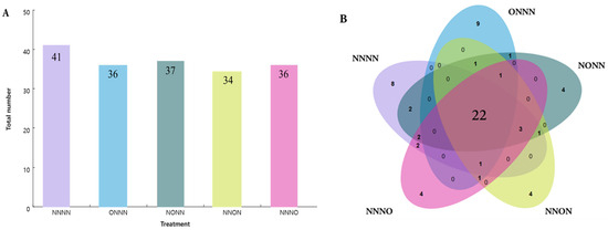 The number of volatile compounds in the different treatments. (A) The total number of volatile compounds detected during each treatment. (B) A Venn diagram showing that all treatments contained 22 common volatile compounds.