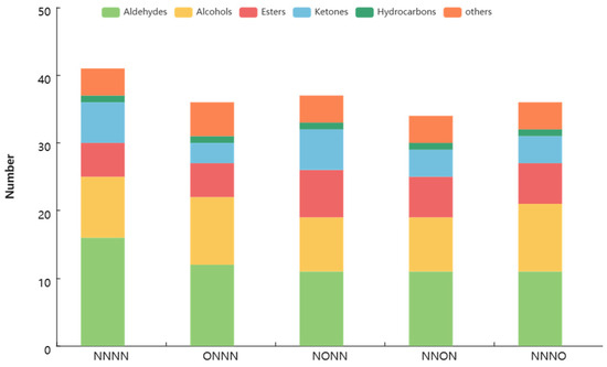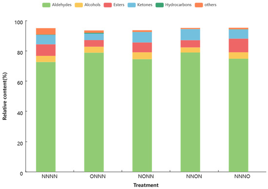 The quantity and relative content of the chemical classes of the tomato fruit volatile compounds under different treatments are shown in Figure 3 and Figure 4, respectively. The most abundant class was aldehydes, followed by alcohols, esters, and ketones. However, the OIINS-related treatments decreased the number of aldehydes, alcohols (except ONNN and NNNO), and ketones (except for NONN). The highest relative content among the five treatments was for aldehydes, ranging from 72.63% to 78.90%, making them the main volatile compounds in the tomato fruits. The OIINS-related treatments increased the relative aldehyde content in the following order: NNON > ONNN > NNNO > NONN > NNNN. This may be attributed to trans-3-hexenal, cis-2-hexenal, and hexanal, which had total content of 76.44% (NNON), 72.22% (ONNN), 71.71%(NONN), 69.36% (NNNO), and 66.87% (NNNN) (Table A1). The relative content of esters, ketones, alcohols, and hydrocarbons was the highest in the NNNO, NNON, NONN, and ONNN treatments, respectively.