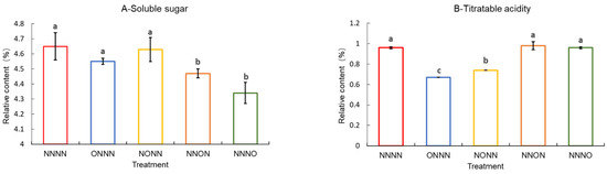 The sugar and acid content of tomato fruits, closely related to their sweetness and acidity, are common indicators of the fruit flavor quality. As shown in Figure 5, the soluble sugar content of the tomato fruits was reduced by OIINS irrigation. Furthermore, the NNON and NNNO treatments reached a significant level, with no clear differences. The ONNN treatment had the lowest organic acid content, followed by the NONN treatment, both reaching a significant level, with no significant differences among the other three treatments (p < 0.05). The soluble solid content was ranked as NNNN > NNON > NNNO > NONN > ONNN, with a significant difference observed between the NNNN- and OIINS-related treatments. The fruit sugar–acid ratio was significantly higher in the ONNN treatment than in the other treatments, followed by the NONN treatment. The NNON and NNNO treatments had significantly lower values than the NNNN treatment, with no significant differences.