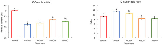 The soluble solid content was determined using a handheld refractometer (PR–32 (0–32%), ATAGO Co., Ltd., Tokyo, Japan). The soluble sugar content was measured using the anthrone method. The titratable acidity was measured by the alkaline titration of the sample using 0.1 M NaOH (titration to pH 8.1) and was expressed as 0.067 g/mmol of malic acid. The sugar–acid ratio is the ratio of soluble solids to titratable acidity.