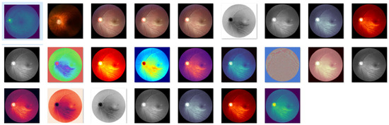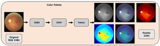 Color palettes were utilized to easily identify the characteristic thinning of the optic nerve bundles that occurs in glaucoma. The images were converted from an RGB three-channel data format to an RGBA four-channel format to represent luminance, and then these were transformed into grayscale before applying various palettes. Several transformations were experimented with from the diverse palettes available in the computer vision image libraries. Ultimately, ophthalmologists selected five specific palettes through a review and verification process. These included a binary series (BinaryR), a blue series (Bone, Mako, and Jet), and a red series (Gist-Heat). These palettes allow for the clear visualization of the structural features of the optic nerve bundles’ thickness, similar to how OCT equipment is used to measure the thickness of the optic nerve. Figure 4 schematically shows the process of applying color palettes.
