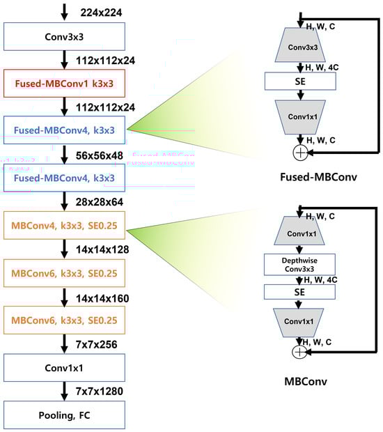 The training model was based on a modified version of EfficientNetV2 [31]. Instead of focusing solely on deepening the layers, as seen in earlier models, such as VggNet, ResNet, and Inception-ResNet, our model also incorporated approaches from models that emphasize cardinality—applying various sizes of convolution filters between layers, such as ResNext and MobileNet. Additionally, we considered models that have evolved based on the resolution of the input images.