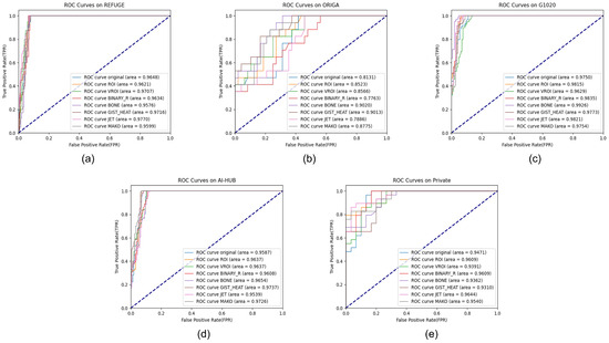 AUCs of each dataset. (a) REFUGE, (b) ORIGA, (c) G1020, (d) AI-HUB, and (e) Private dataset. These results are the individual outcomes for each of the input data before the ensemble.