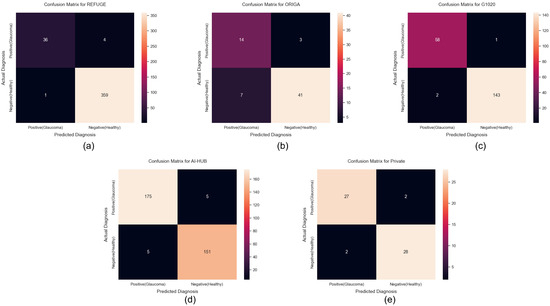 Confusion matrix of ensemble result for each dataset. (a) REFUGE; (b) ORIGA; (c) G1020; (d) AI-HUB; (e) Private dataset.