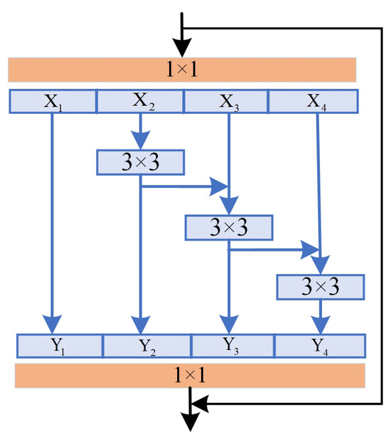 To improve the multi-scale representation capabilities of CNNs, GAO et al. [24] proposed a novel multi-scale backbone architecture called Res2Net, which is utilized for object detection, class activation mapping, and salient object detection. This method divides the input features into multiple branches, with each branch responsible for extracting features at different scales. These branches are connected together in a manner similar to residual connections, enhancing the scale representation capability of features. The framework of Res2Net is illustrated in Figure 1.