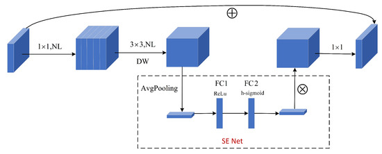 MobileNetv3, introduced by [28], incorporates depthwise separable convolution, inverted residual blocks, and Squeeze-and-Excitation (SE) modules [29]. The input feature map is initially expanded through convolutional layers to extract additional features. Subsequently, Depthwise Convolution (DW) is applied, followed by the SE module to adjust the weights of each channel, thereby enhancing the model’s accuracy. Finally, downsampling is performed through convolutional layers. When the number of input and output features matches, shortcut connections are utilized by the Bottleneck (Bneck). The structure of the Bneck network is depicted in Figure 3.