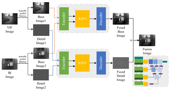 We propose a lightweight multi-scale infrared and visible image fusion method. The method first divides the original visible-light and infrared images into base and detail layers using mutually guided image filtering (muGIF) [30], which allows for extracting more hierarchical representations in high-frequency and low-frequency domains. The base layer encompasses information such as image content and spatial structure, whereas texture and local shape information are contained within the detail layer. Subsequently, sub-images at the same hierarchical level are input into the image fusion network for fusion. Finally, the fused images from both high-frequency and low-frequency components are merged to derive the final fused image. The flowchart of the proposed algorithm is illustrated in Figure 4.