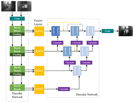 When fusing sub-images at the same hierarchical level, we propose a lightweight multi-scale infrared and visible fusion network. Taking the fusion process of the base layer as an example, its architecture is illustrated in Figure 5. We draw inspiration from the RFN-Net’s network structure, where the fusion network consists of encoder, fusion, and decoder modules. We introduce depthwise separable convolution into the encoder and decoder networks, replacing conventional convolutions in the original network to address the issue of the relatively large parameter size. The encoder module of the encoder network comprises two improved bneck layers and a max-pooling layer. Through this combination, the encoder can extract multi-scale depth features with a smaller computational cost. The multi-scale fusion network R2FN is employed to integrate multimodal depth features extracted at each scale. The fused features are then input into the decoder with a nested connection structure. The advantage of this structure is its ability to avoid information loss from previous layers during convolution operations, thereby fully utilizing multi-scale features for image reconstruction.