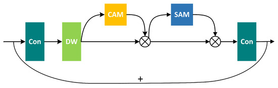 We adopted the Bottleneck (Bneck) structure from MobileNetv3. DSC is capable of reducing the number of model parameters and computational complexity, but it might also adversely affect the convolution’s capacity to extract features. Therefore, the attention module CBAM [31] is introduced to enhance the model’s attention concentration ability and improve the information-processing mechanism, effectively improving the quality of image fusion and the overall performance of the model. CBAM, as a lightweight and versatile attention mechanism, can be easily added to the convolutional layers of any network at a minimal cost. CBAM applies attention mechanisms simultaneously in both the channel and spatial dimensions, enhancing the model’s accuracy. Additionally, the parameter size of the improved network has been further decreased. The enhanced Bneck structure is illustrated in Figure 6.