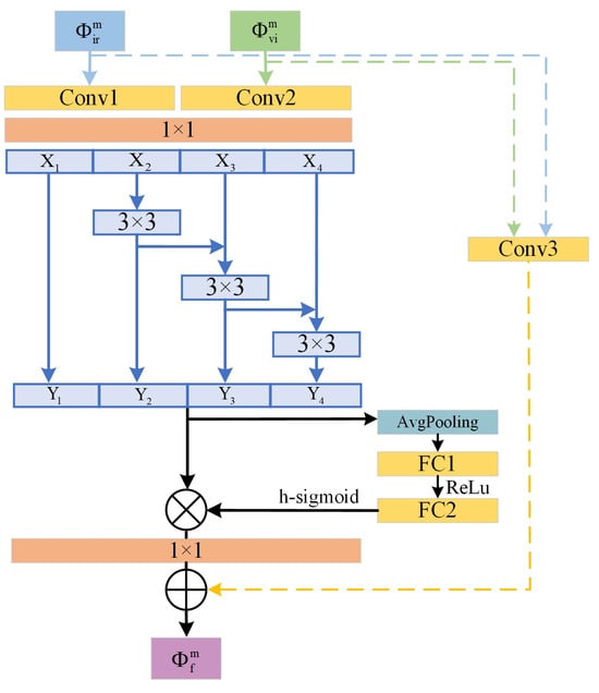 In the figure, and represent the infrared and visible depth features extracted by the encoder network, respectively. Initially, the outputs of Conv1 and Conv2 are concatenated and fed into a 1 × 1 convolution for channel transformation. The feature maps are subsequently partitioned into s subsets, each characterized by an identical spatial size and 1/s of the total channel count, with s serving as the scale control parameter. The first subset, , remains unchanged and is directly propagated to , while the remaining subsets undergo 3 × 3 convolution operations before being added to the next feature subset. Subsequently, the acquired feature maps are fed into the SE module to modify the weights of each channel, thereby improving the model’s accuracy. Here, ReLU and h-sigmoid are sequentially utilized as activation functions. Finally, the results from the 1 × 1 convolution are added to the fusion convolutional layer Conv3 to obtain the final outcome C. In our experiments, we selected s = 4 as the scale control parameter.