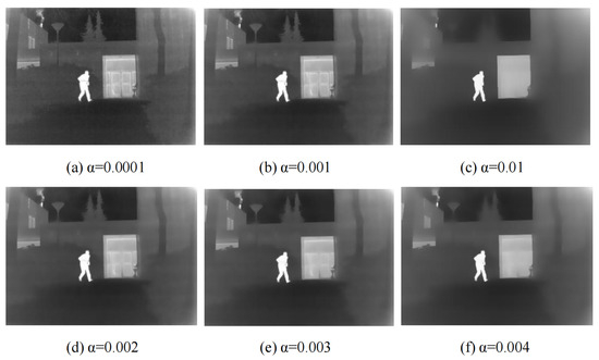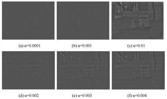 As discussed in Section 3.1, mutually guided image filtering is employed during frequency-domain decomposition to decompose the input source image into base and detail layers. The quality of filtering critically impacts the final image fusion performance. Therefore, in the experiments of this section, is set to 0.0001, 0.001, 0.01, 0.002, 0.003, and 0.004 to analyze its influence on the filtering effect. (Only the experimental results of infrared image frequency-domain decomposition are listed in this paper, and it is observed that the trends in the decomposition effects of visible-light images are consistent with those of infrared images.) The experimental results are shown in Figure 8 and Figure 9.