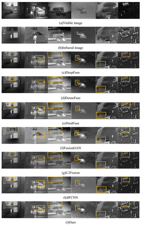 To validate the effectiveness of our proposed method, we conducted a subjective comparative experiment on a subset of images from the TNO dataset, comparing them with various image fusion algorithms. The comparative results of each algorithm are shown in Figure 10. The comparison results show that the FusionGAN method fails to effectively preserve detailed texture information from the visible-light images. NestFuse and IFCNN methods demonstrate a good representation of the target contours but do not effectively retain the thermal radiation information from the infrared images. The DeepFuse, DenseFuse, and U2Fusion methods exhibit clear contour information and target features, but the introduction of excessive noise leads to poor fused image quality. Particularly in the yellow-boxed areas in Figure 10, none of these algorithms achieve the desired fusion results. In contrast, our algorithm maintains a better balance of information between the infrared and visible-light images in most fusion scenarios, resulting in superior fusion results.