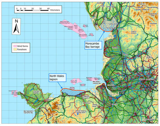 Location map for North Wales Coastal Lagoon and Morecambe Bay Estuarine Barrage.