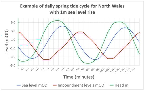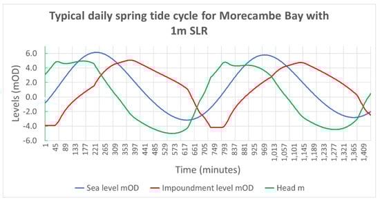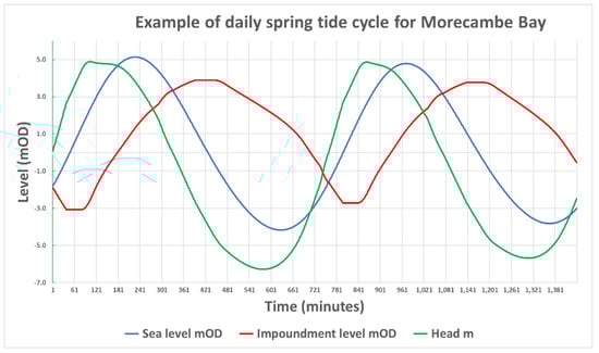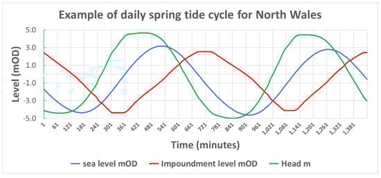 The mean spring tidal ranges for NW and MB are 7.20 m and 8.49 m, respectively []. For the design, the highest spring tide in the year should be selected rather than the mean. The maximum operating head can be read from the 0D model. Figure 2 and Figure 3 show examples of daily spring tide cycles. The blue lines represent the sea surface levels, the red lines indicate the impoundment surface levels, and the green lines are the head differences available to generate electricity.