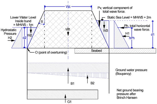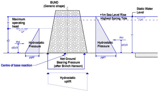 A generic form of bund and system of forces is shown in Figure 13; d1 and d2 represent the average water levels of the sea and impoundment, respectively. H1 and H2 are the corresponding horizontal hydrostatic forces. Ph is the total horizontal wave force, which acts at a height of hPh above the base.